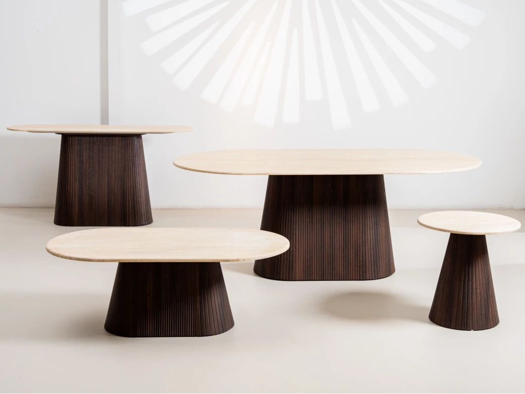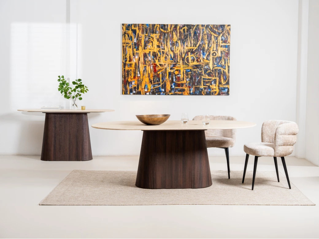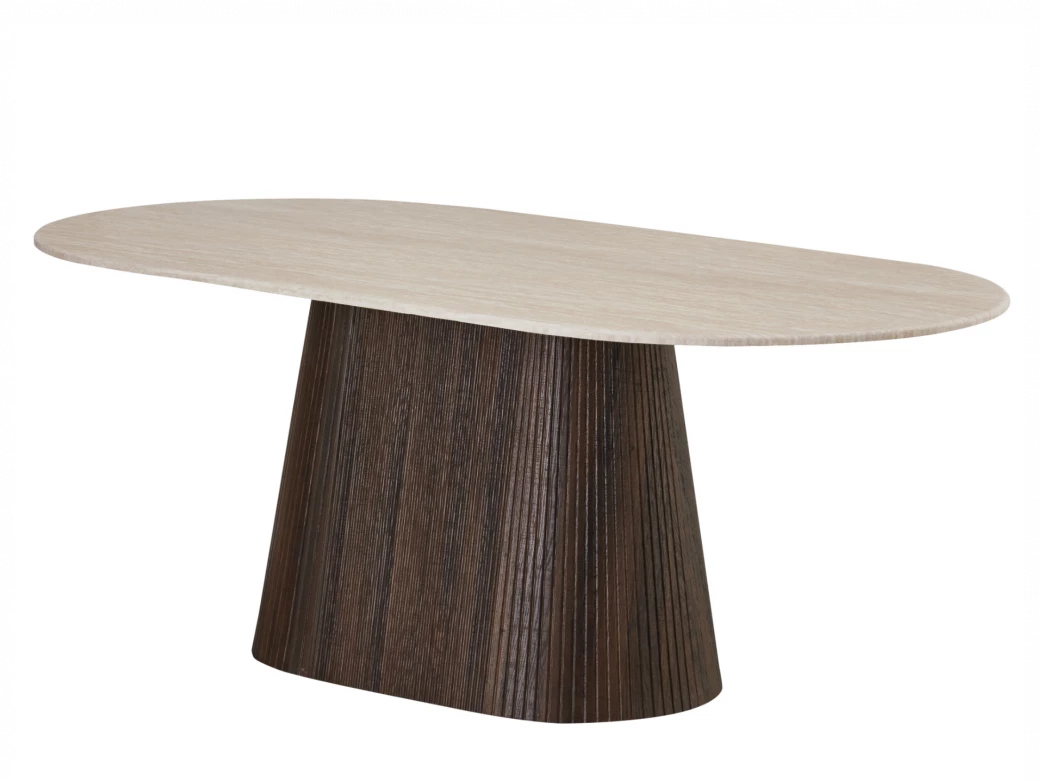 用这张优雅的餐桌提升您的用餐体验,桌面为奢华石质桌面,表面呈现精致的石灰华。光滑精致的表面为你的用餐空间增添了永恒的魅力,而坚固的波纹MDF底座,表面呈现浓郁的浓缩咖啡色调,为设计增添了层次感和对比。这张桌子融合了现代风格与经典魅力,使其成为现代餐厅的完美核心,既耐用又美观,适合日常使用或特殊场合。
