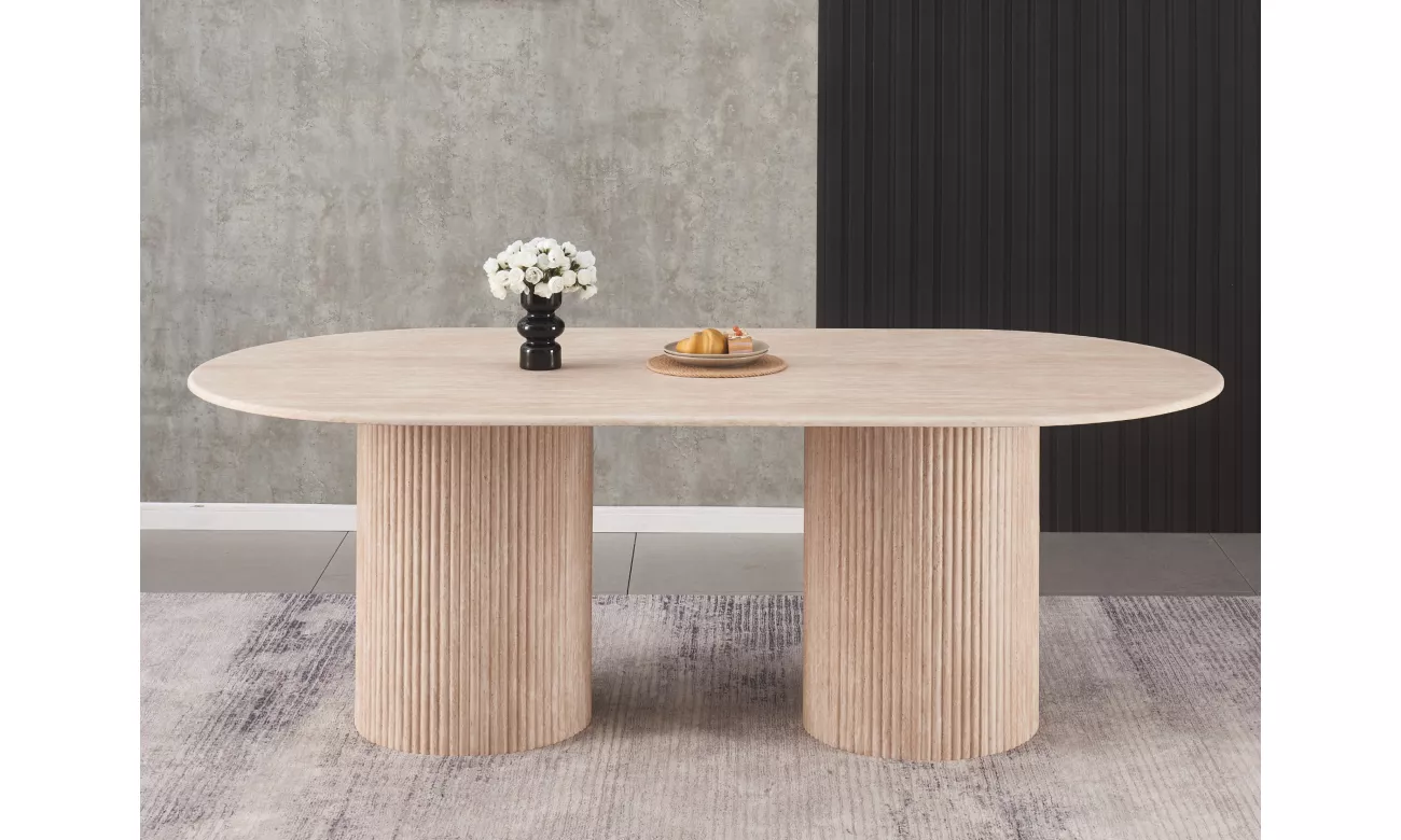 设计以石材为灵感的桌面,配有精致的白色石灰华印花,搭配波纹MDF底座,表面呈现协调的石灰华效果。最终呈现出一件醒目且多功能的标志性单品一非常适合为任何用餐空间增添一抹现代雅致。