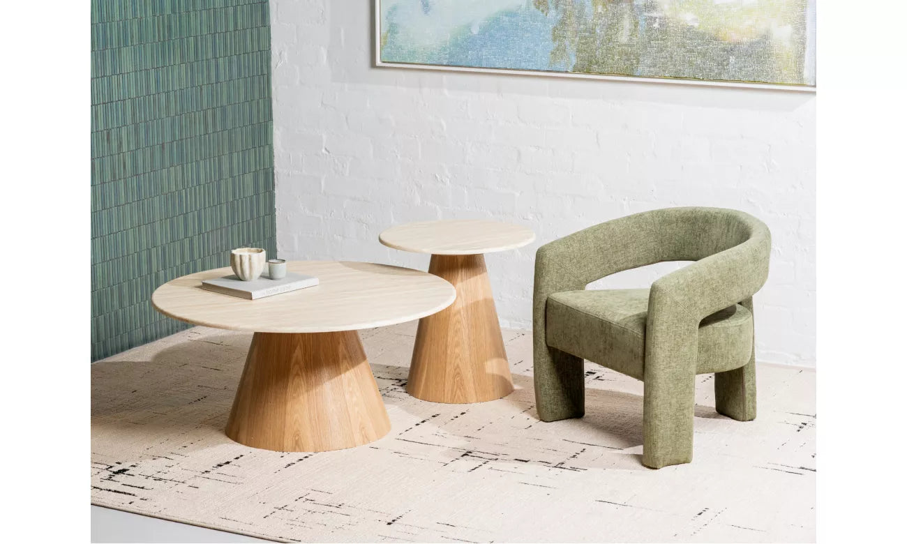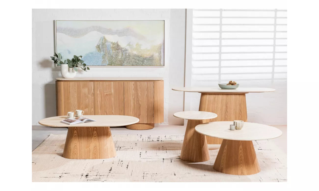 Waverley系列将有机质感与现代设计融合,打造出既永恒又现代的系列。每件作品顶部都覆盖着哑光白色石灰华人造大理石,呈现出既精致又耐用的石质外观。桌身和桌架采用天然漆面MDF制成,增添温暖与优雅。凭借柔和的曲线和多变的造型,Waverley系列为客厅和餐厅室内带来了和谐与低调的奢华。